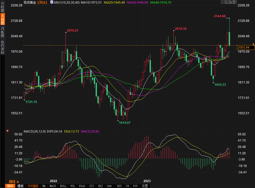 现货黄金收报2004.41,跌幅1.19%。本周,