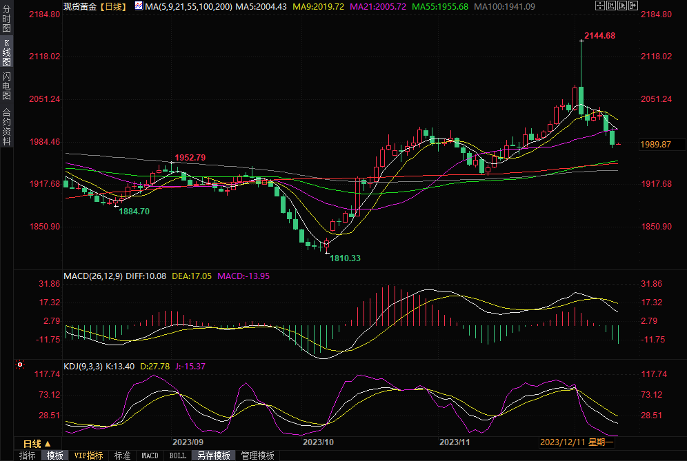 现货黄金进一步下跌,回落至2000美元/盎司关口下方,最终跌至1980美元/盎司区间,盘中一度刷新11月21日以来新低至1975.77美元/盎司,收报1981.63美元/盎司。