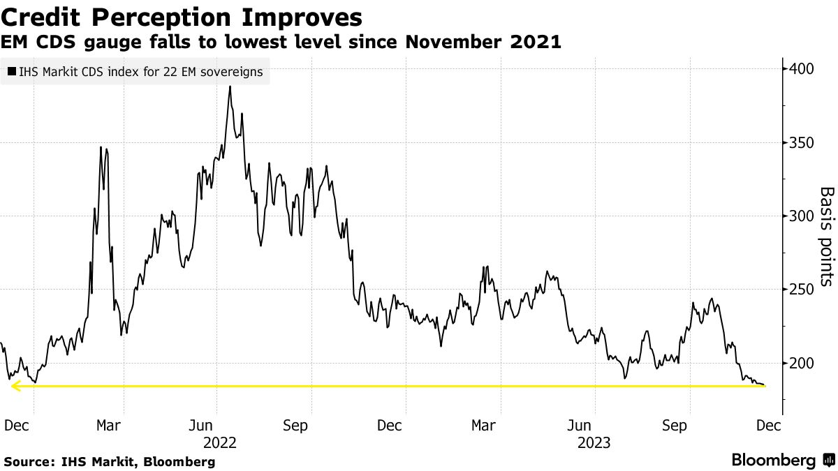 IHS Markit数据显示,涵盖22个政府借款人的信用违约掉期指标收窄,使得利差缩小到185个基点。