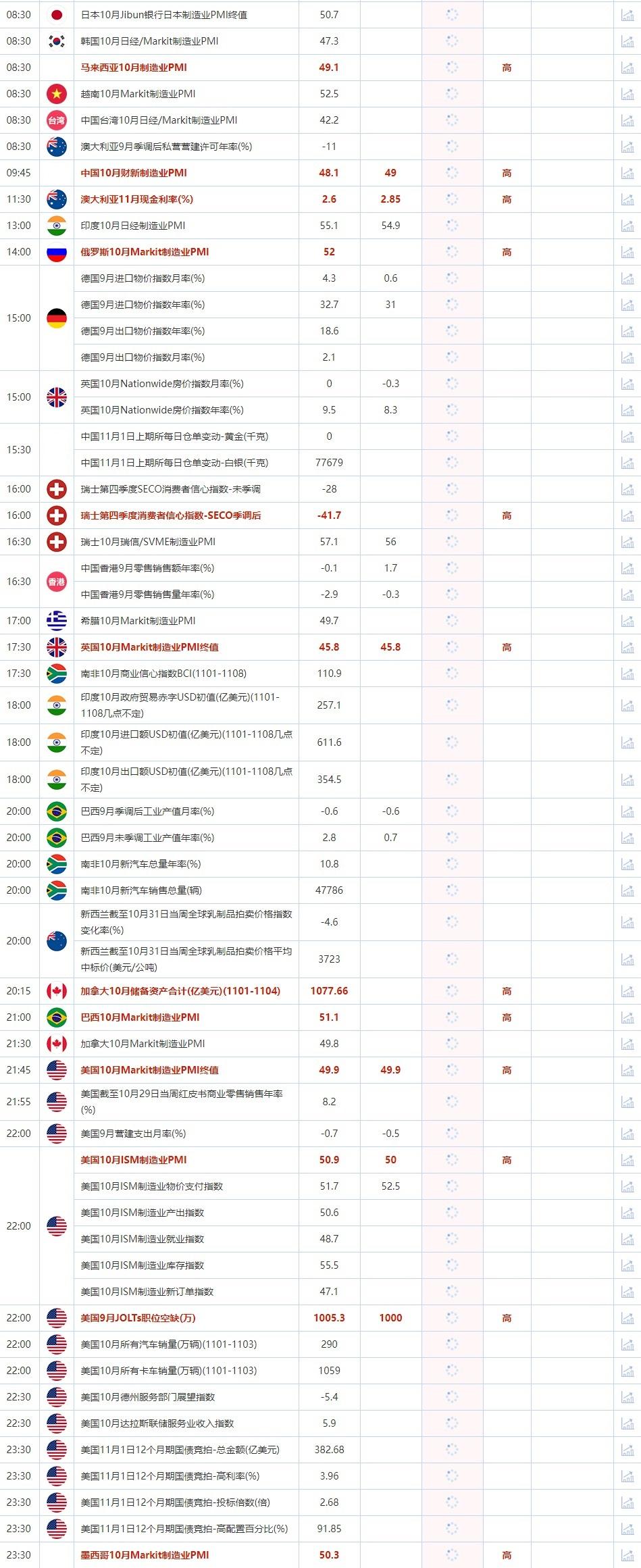 09:45 中国10月财新制造业PMI , 前值 48.1 , 预期值 49 , 公布值:待发布11:30 澳大利亚11月现金利率(%) , 前值 2.6 , 预期值 2.85 , 公布值:待发布13:00 印度10月日经制造业PMI , 前值 55.1 , 预期值 54.9 , 公布值:待发布