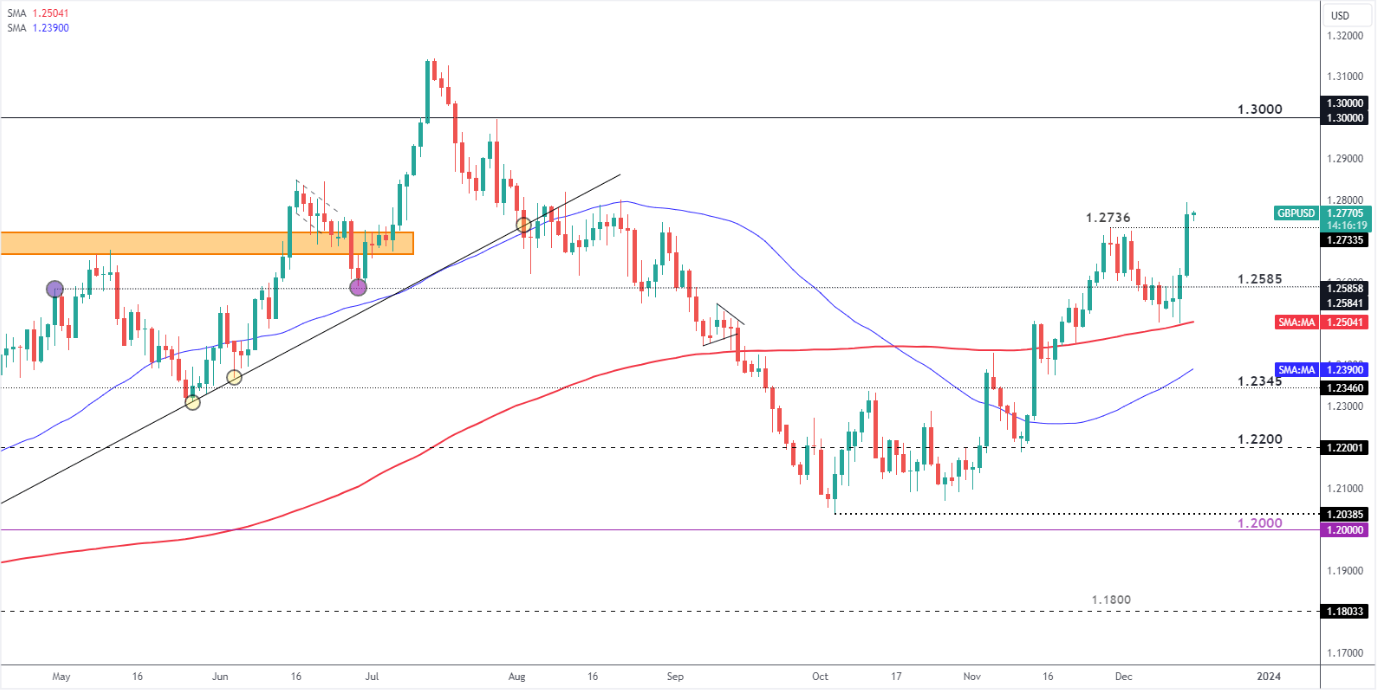 在美联储和英国央行本周召开会议之前,英镑轻松站上200移动平均线,测试大幅上涨前的动态支撑位。200移动平均线充当了跳板,价格看起来将在11月份的高点1.2736上方收盘。