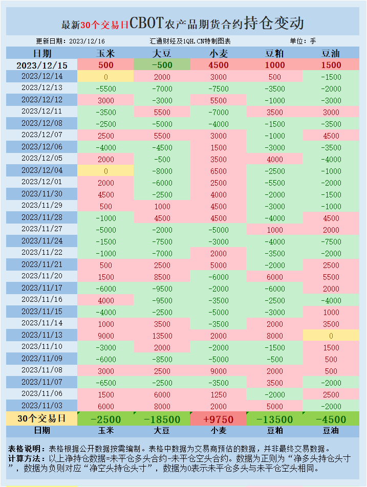 CBOT持仓变动情况交易商估算的结果显示,大宗商品基金本周五(12月15日)增加小麦、豆粕、豆油、玉米投机性净多头头寸,增加大豆投机性净空头头寸。本周大宗商品基金增加豆粕净多头头寸,增加大豆、豆油、玉米、小麦净空头头寸。最新30个交易日,大宗商品基金增加豆油、玉米、豆粕、大豆、投机性净空头头寸,增加小麦投机性净多头头寸。