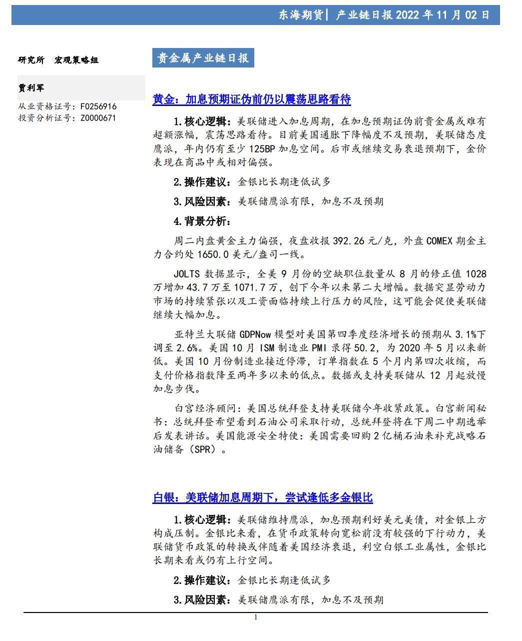 标题:【东海期货11月2日产业链日报】贵金属篇:ISM制造业新低,金银偏强运行