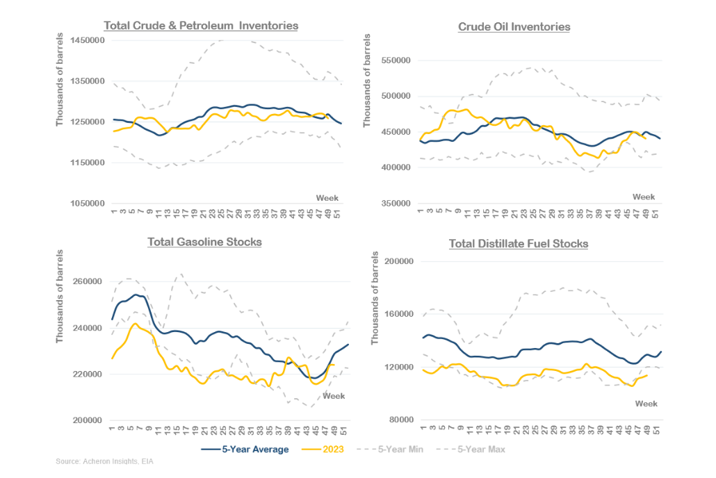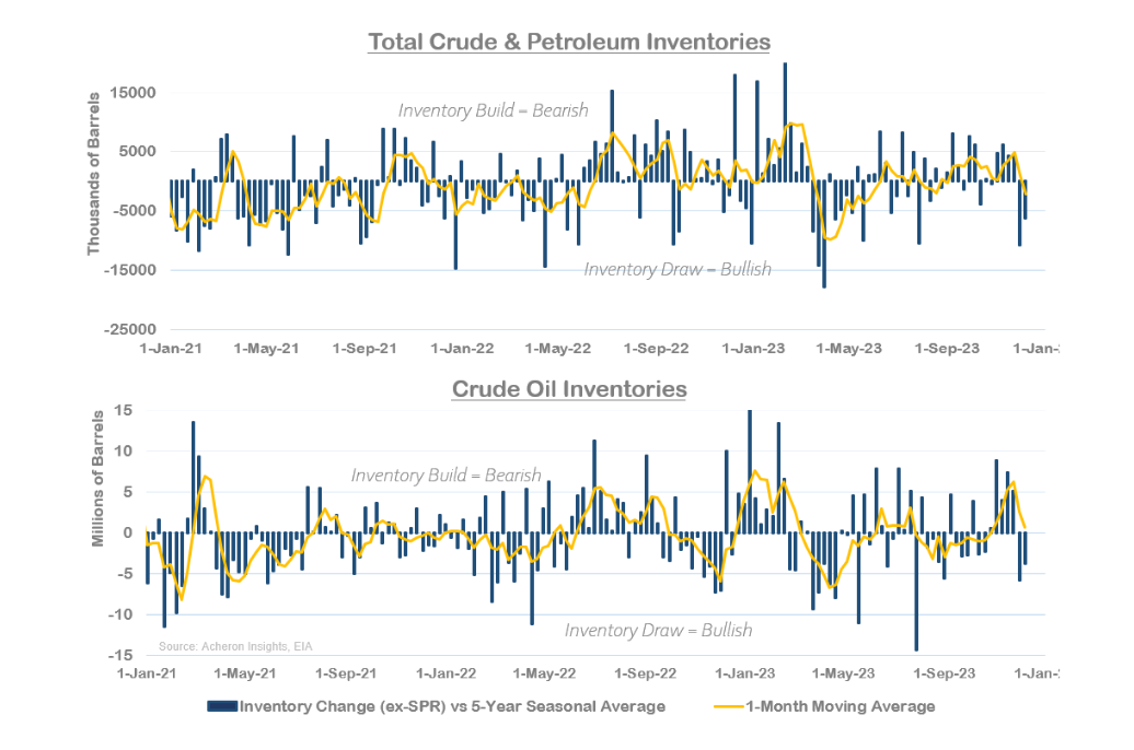 随着汽油裂解量的上升和炼油需求的跟进,为了证实原油市场确实市场供应紧张,需要看到原油库存低于季节平均水平作为印证,这种情况正在出现。数据显示,原油总库存出现了自第二季度以来相对于季节平均水平的最大连续库存消耗。2024年第一季度欧佩克+的减产协议如果能够很好的执行,原油价格反弹可能将会出现。