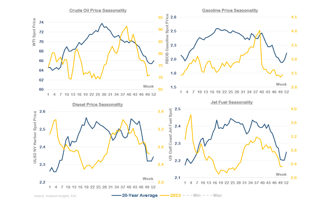 (WTI原油、汽油、柴油、航空煤油价格的季节变化情况)
