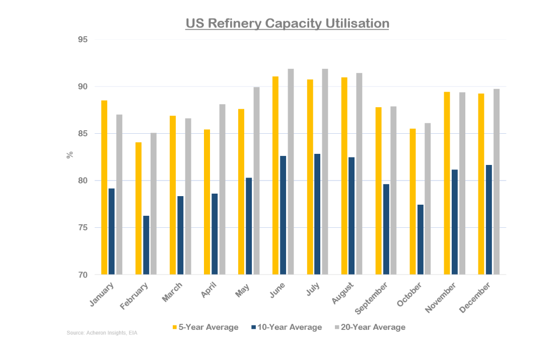 其次,季节性因素在发生变化。季节性因素是近期原油价格暴跌的原因。从历史来看,10月和11月原油和能源价格最低迷的月份,这一时期在北半球夏季驾驶季节之后,随着炼油厂维修量增加,炼油厂的产能利用率下滑。