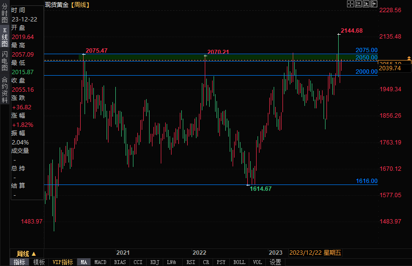 一年过去了,在对美联储预期方面,我们仍希望看到美联储停止加息,不过现在变得更乐观。美联储主席鲍威尔在12月议息会后指出,美联储已经开始就可能的降息展开讨论,这超出了市场的预期。虽然有其他几位美联储成员在几天后讲了一些鹰派讲话,但黄金仍然维持了涨势。从下图的周线图也可以看出,美联储态度影响相当明显。