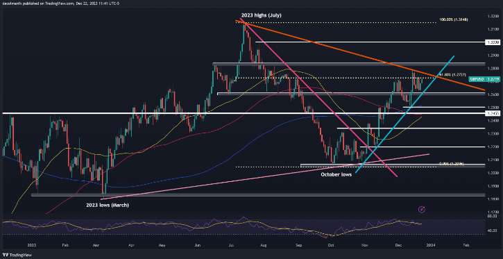 英镑/美元在周末加速走高,有可能突破集群阻力位(从1.2727到1.2760),该阻力位是关键的斐波那契阈值,与从2023年峰值延伸的下降趋势线一致。买家是否能够集中力量推动价格突破这一关口还有待观察,但一旦突破,所有目光都将集中在1.2840,然后是1.4000。