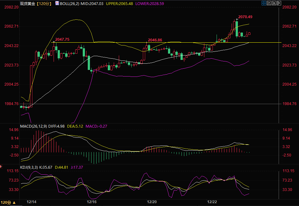 现货黄金窄幅震荡,目前交投于2054.66美元/盎司附近,仍处于近三周相对高位。上周五出来的美国11月PCE环比出现负增长,为近三年首次,强化了美联储明年3月份降息的概率,这一度帮助金价刷新12月5日以来新高至2070美元附近。