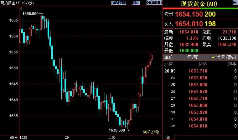 现货黄金上涨1.20%至1653.08美元/盎司;COMEX期金主力合约上涨0.95%至1656.4美元/盎司;