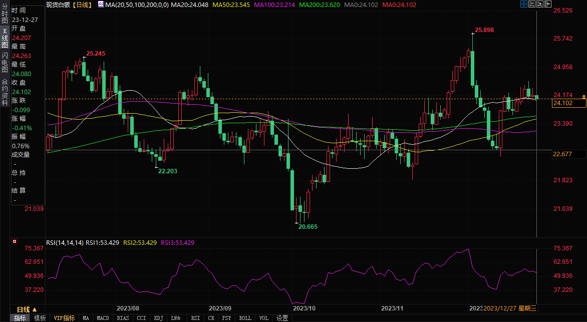 现货白银由年初的24.045涨至23.981,涨幅0.17%。