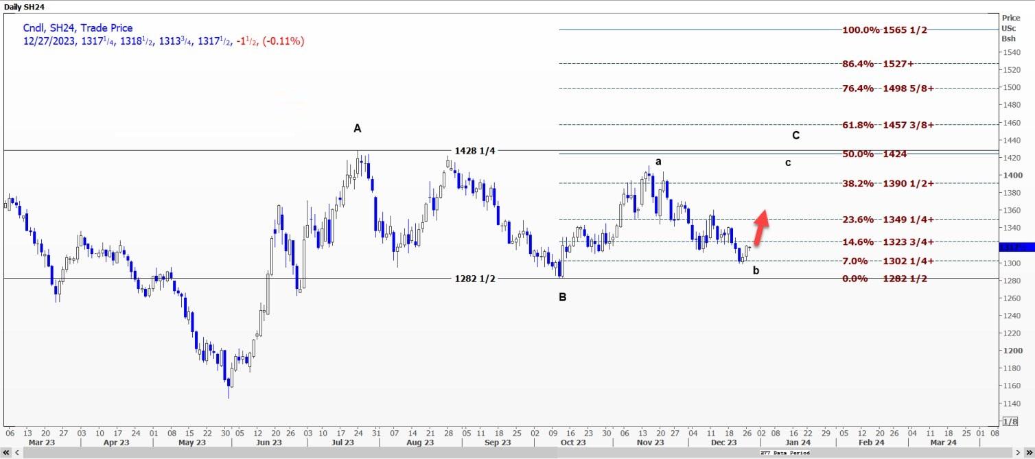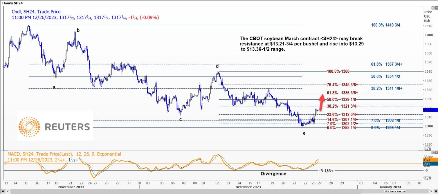 CBOT大豆可能上涨至13.29美元至13.3650美元区间CBOT大豆3月合约SH24可能突破每蒲式耳13.2175美元的阻力位,并升至13.29美元至13.3650美元的区间。