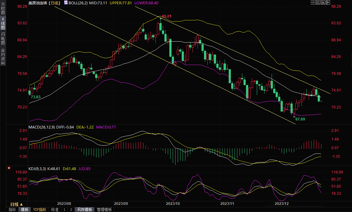 WTI原油期货2024年2月合约结算价收报71.77美元/桶,跌幅3.16%或2.34美元/桶,盘中一度创一周新低至71.70美元/桶。