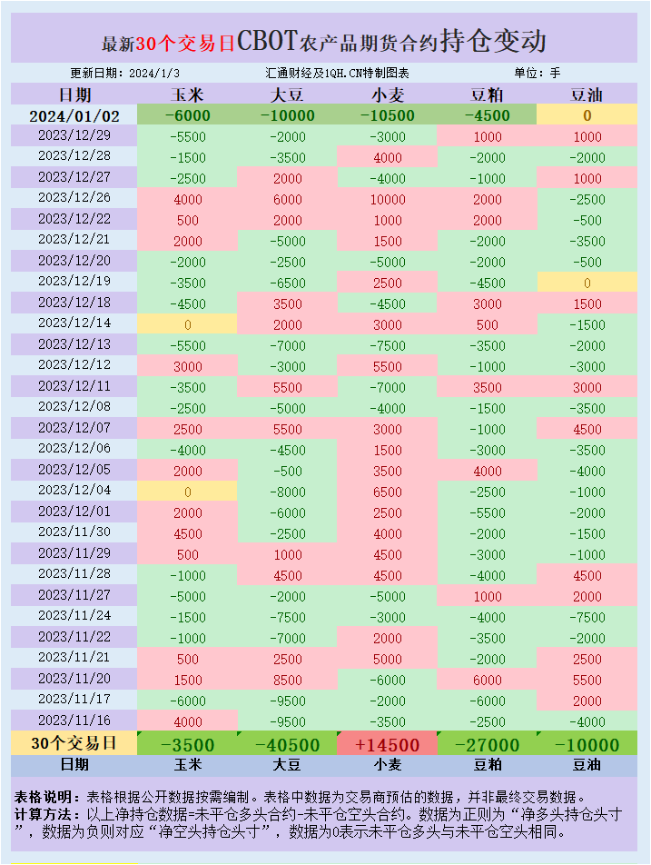 交易商估算的结果显示,本周二(1月2日),大宗商品基金增加大豆、豆粕、小麦、玉米投机性净空头头寸,豆油未平仓多头与未平仓空头相同。最新30个交易日,大宗商品基金增加豆油、豆粕、大豆、玉米投机性净空头头寸,增加小麦投机性净多头头寸。