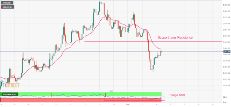 近期,金价走势出现了一些变化。技术分析显示,金价已经实现了均值回归,并接近20日指数移动平均线(EMA)。目前两小时交易价格约为2050美元。然而,贵金属市场曾一度跌破了2055美元附近的支撑区域,导致大幅下跌。这一区域未来将成为金价的阻力位。