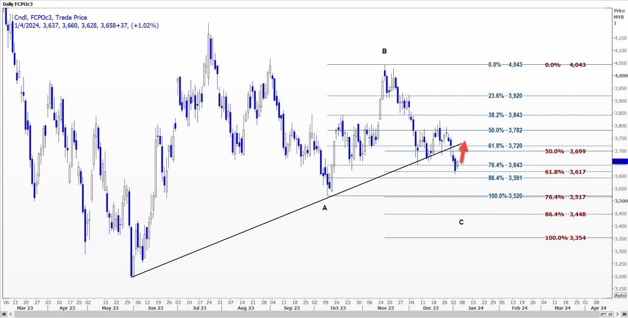 日线图上,市场稳定在3617林吉特的关键支撑位附近。企稳至少可能引发上涨趋势线回调。