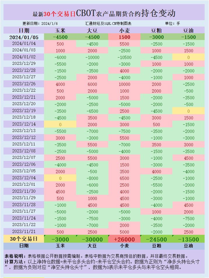 CBOT持仓变动交易商估算的结果显示,本周四(1月4日),大宗商品基金增加小麦投机性净多头头寸,增加玉米、大豆、豆粕、豆油投机性净空头头寸。2024年第一周,大宗商品基金增加小麦、玉米、大豆、豆粕、豆油投机性净空头头寸。最新30个交易日,大宗商品基金增加豆油、豆粕、大豆、玉米投机性净空头头寸,增加小麦投机性净多头头寸。