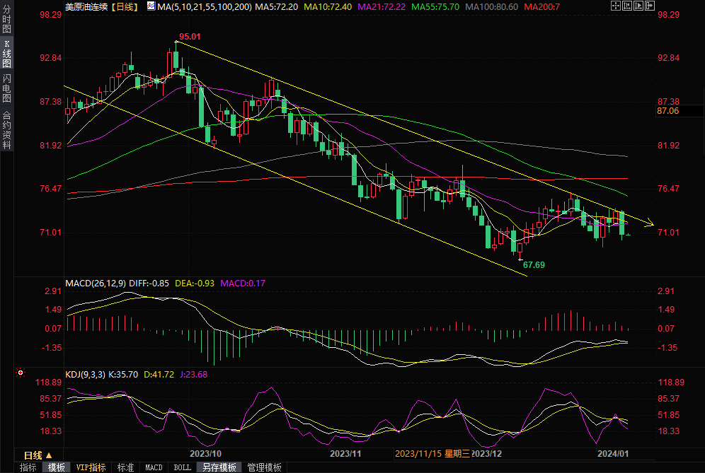 WTI原油期货2024年2月合约结算价收报70.77美元/桶,跌幅4.12%或3.04美元/桶,盘中最低曾触及70.12美元/桶。