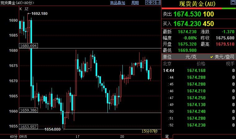 现货黄金下跌0.43%至1668.23美元/盎司;