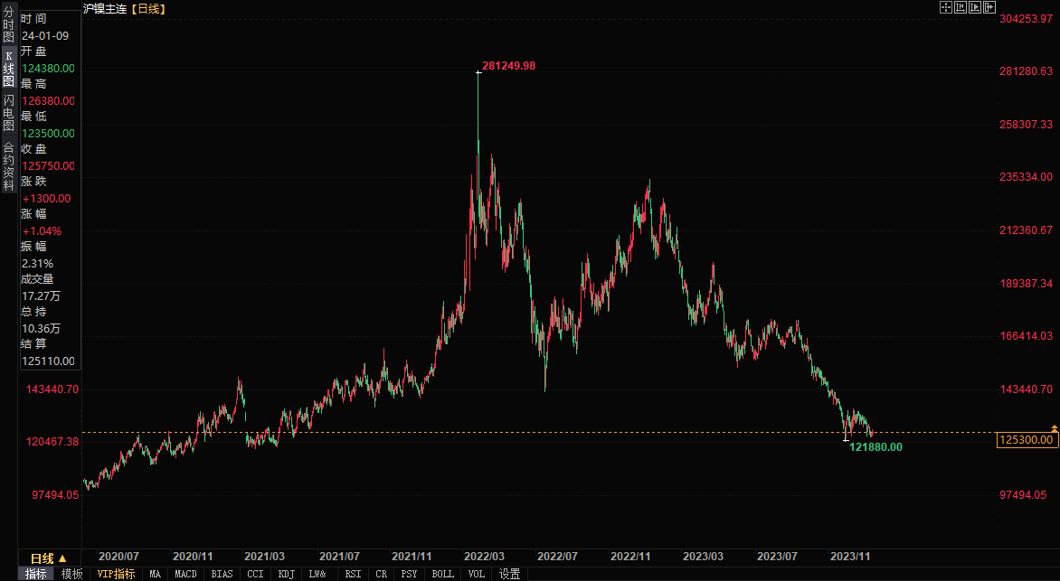 2023年8月以来,镍价连跌5个月。在不断下降的趋势中,镍价跌至2021年4月以来的最低点。镍是2023年表现最差的贱金属之一,2023年全年价格下跌约45%。