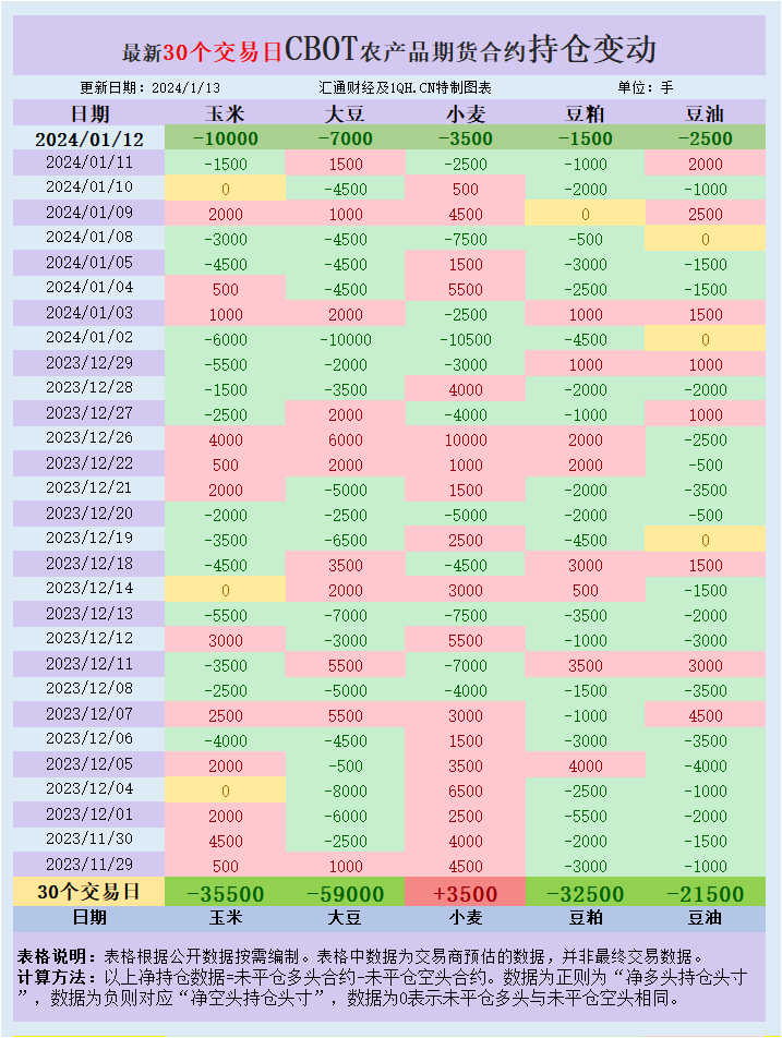 CBOT持仓变动情况交易商估算的结果显示,本周五(1月12日),增加小麦、豆粕、玉米、大豆、豆油投机性净空头头寸。最新30个交易日,大宗商品基金增加豆油、豆粕、大豆、玉米投机性净空头头寸,增加小麦投机性净多头头寸。