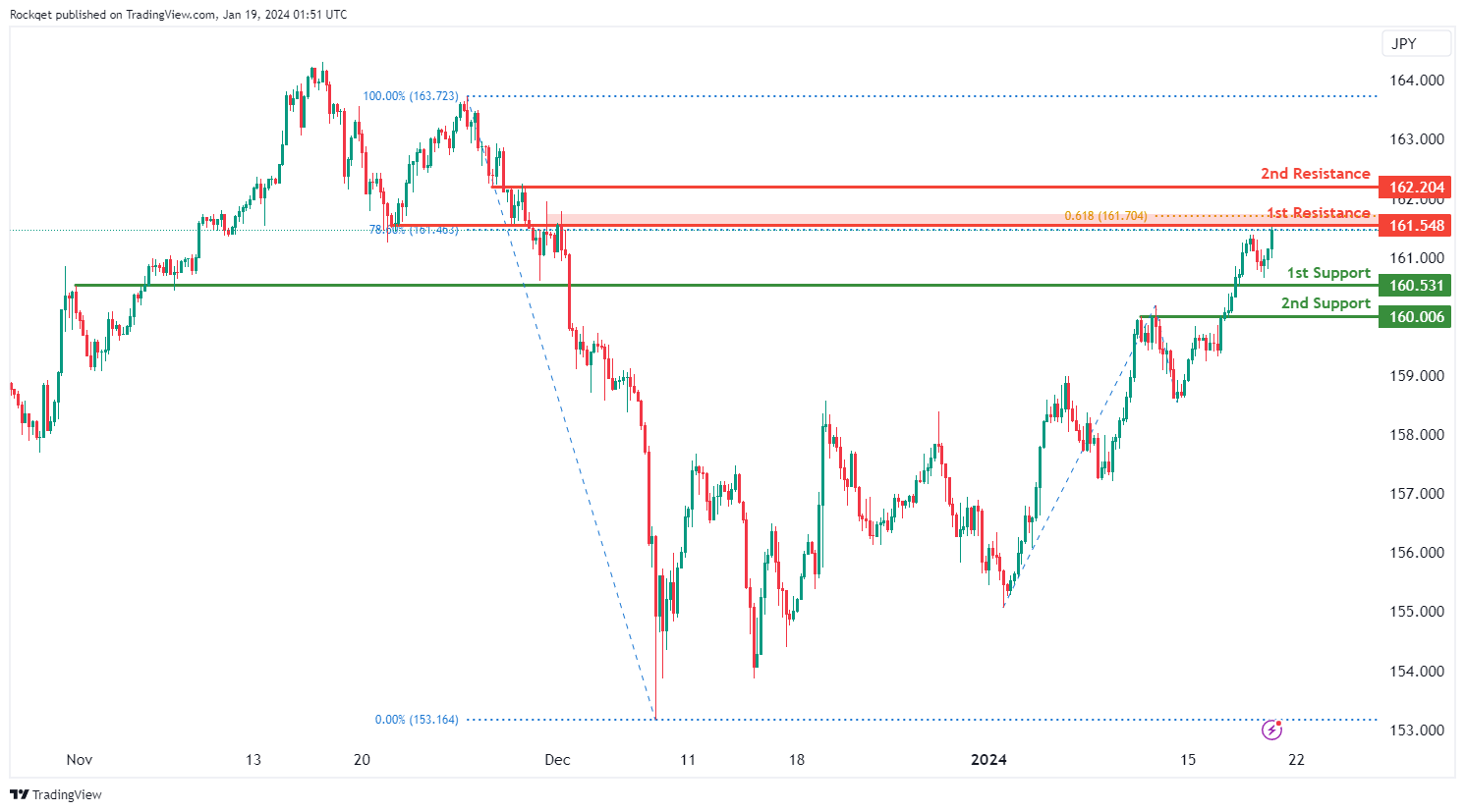 第一个阻力位161.54被认为是一个重叠阻力位,它与斐波那契水平的汇合点一致,即78.60%的回撤位。更高的第二阻力位162.20也被认为是一个重叠阻力,进一步加强了其作为潜在阻力区的重要性。