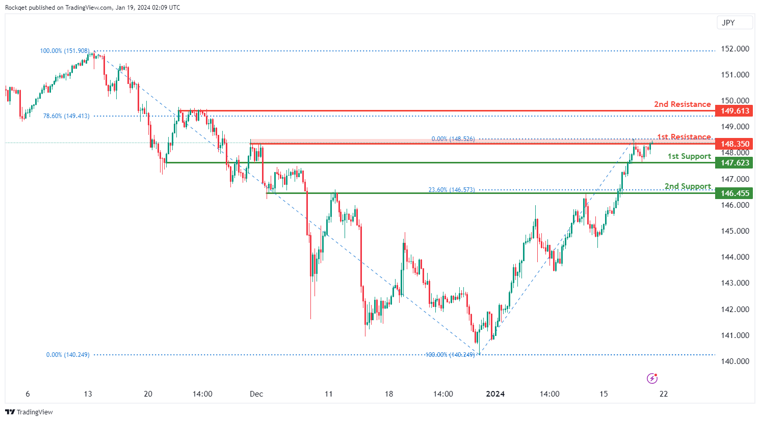第一个阻力位148.35被视为回撤阻力。更高的第二个阻力位149.61也是一个回调阻力,接近78.60%的斐波那契回撤水平,进一步加强了其作为潜在阻力区的重要性。