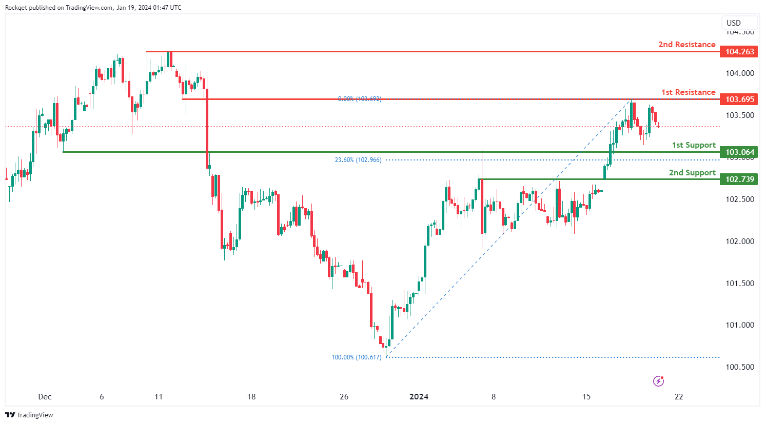 上行方面,第一阻力位103.69被视为重叠阻力位。更高的第二阻力位104.26被视为回调阻力位,进一步强化了其作为潜在阻力区的重要性。