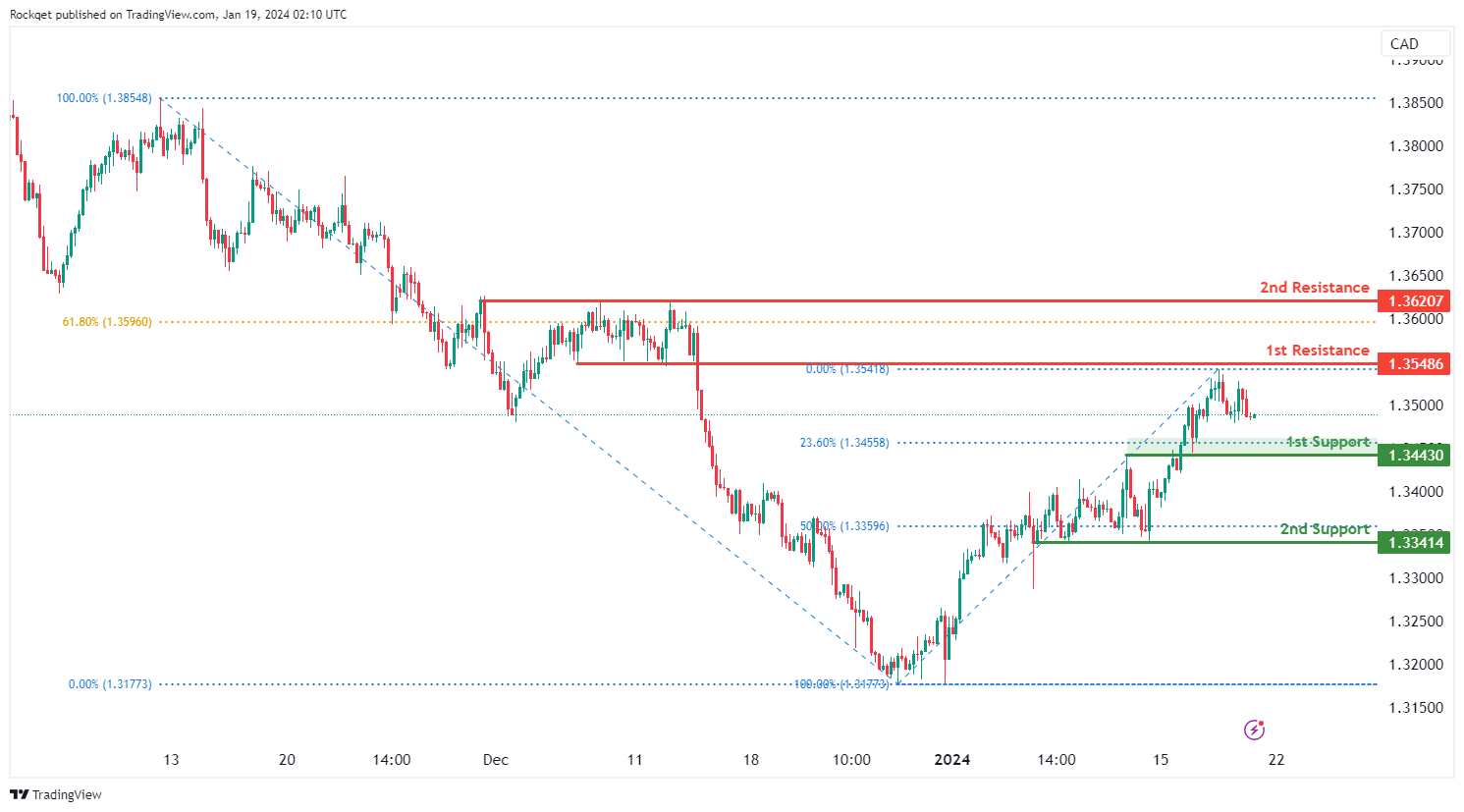 上行方面,第一个阻力位1.3548被视为回撤阻力。更高的第二个阻力位1.3620也是一个回调阻力,接近61.80%的斐波那契回撤位,进一步加强了其作为潜在阻力区的重要性。