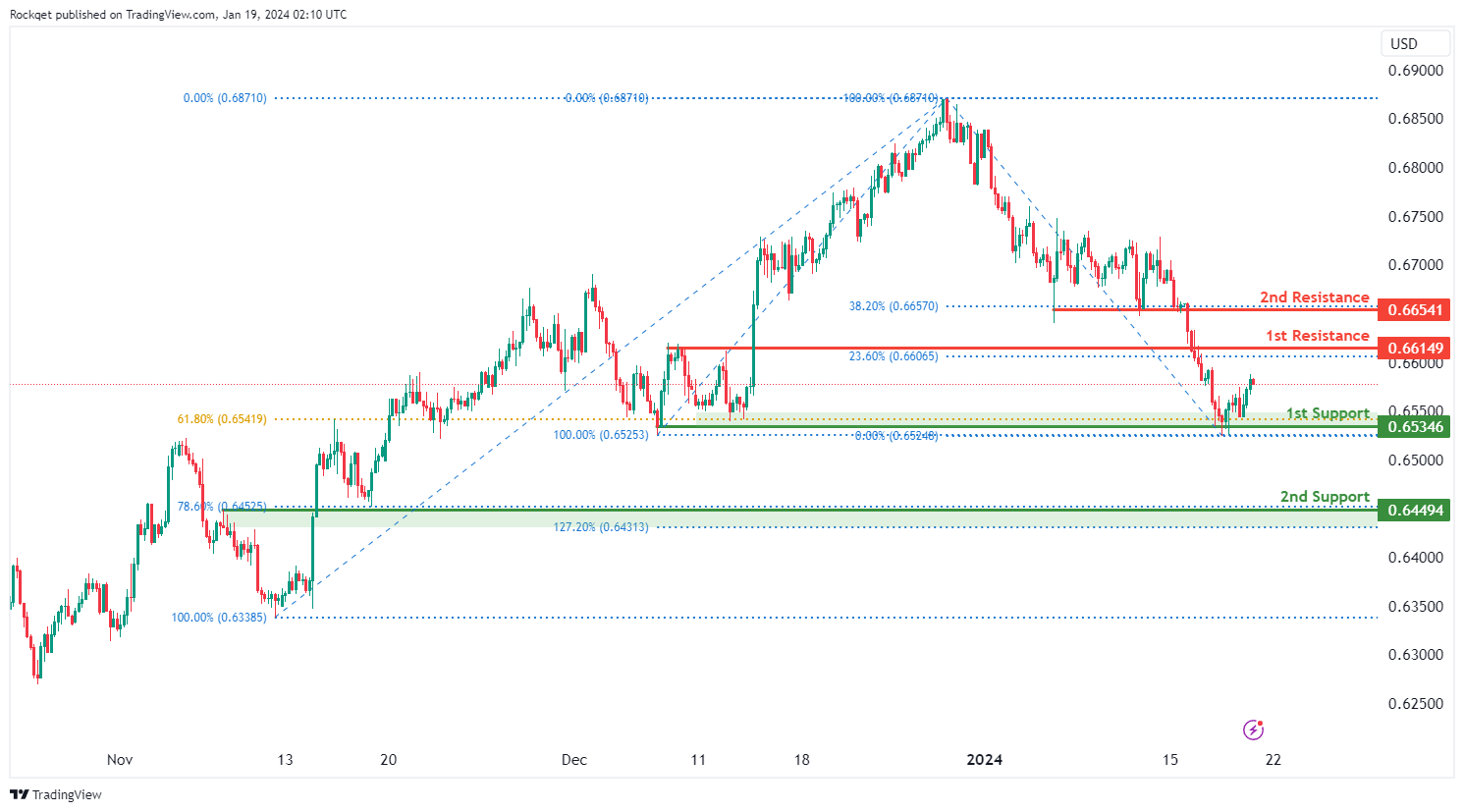 第一个阻力位0.6614被视为回调阻力,与23.60%斐波那契回撤位一致。在更高的位置,第二个阻力位0.6654也是一个回调阻力,与38.20%的斐波那契回撤位一致,表明进一步上行的潜在障碍。