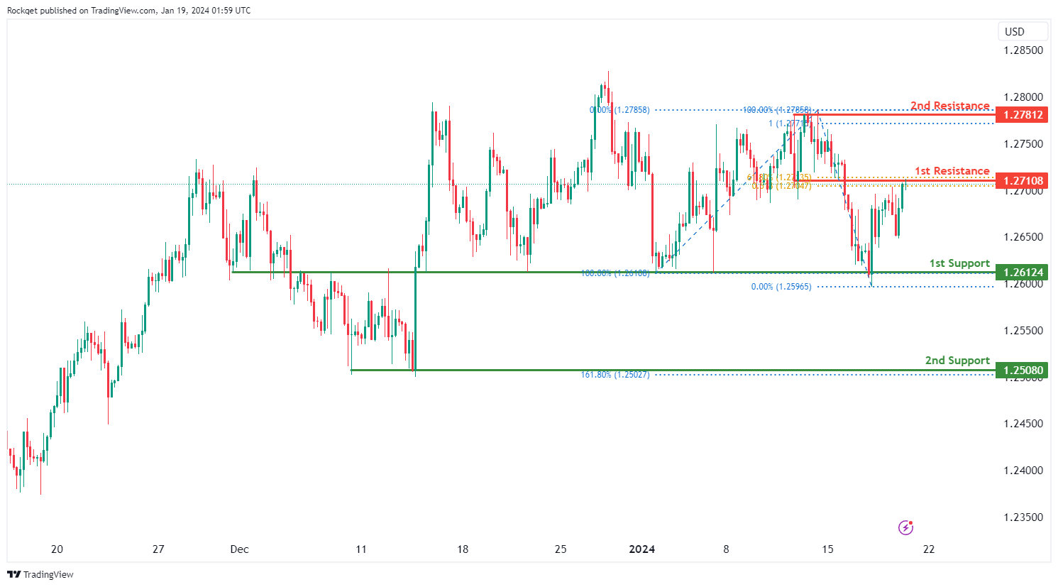 下行方面,1.2612的第一支撑位被视为重叠支撑位。再往下,第二个支撑位1.2508被标记为与161.80%斐波那契扩展位一致的摆动低点支撑位,进一步加强了其作为关键支撑位的重要性。