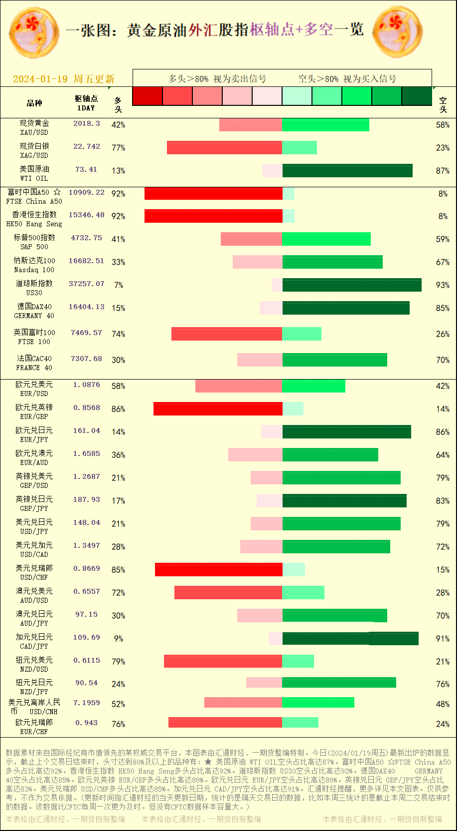 一张图:2024/01/19黄金原油外汇股指"枢纽点+多空占比"一览