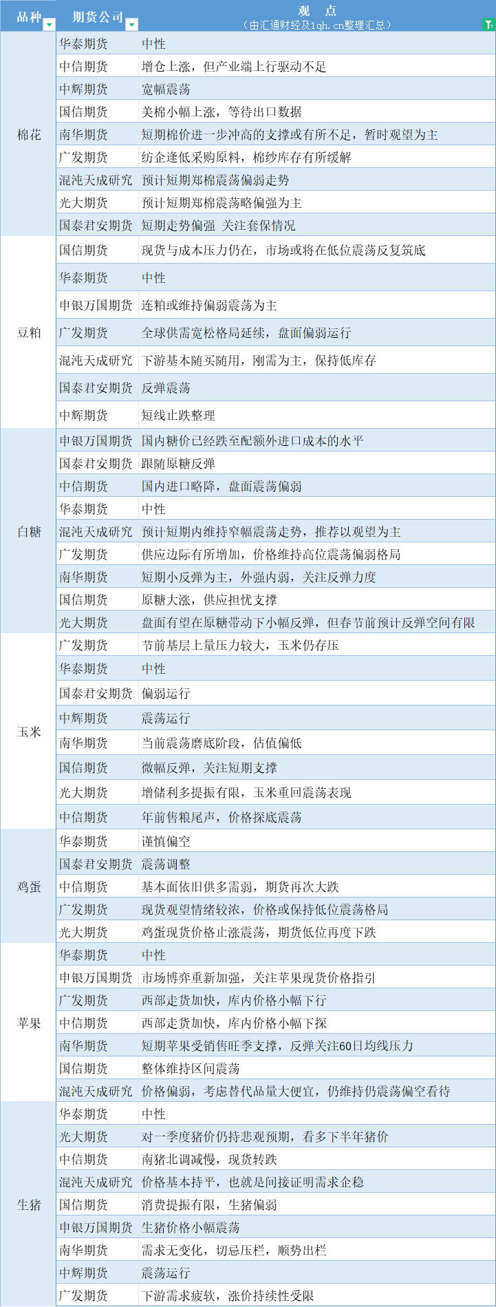标题:期货公司观点汇总一张图:1月19日农产品(棉花、豆粕、白糖、玉米、鸡蛋、生猪等)