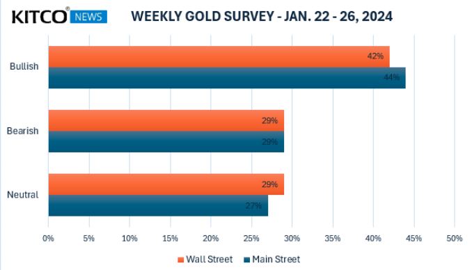 最新的Kitco News每周黄金调查显示,机构专家和散户交易员对下周金价的预期接近一致,其中多数人预测贵金属将上涨,而大多数人现在认为金价将停滞或下滑。