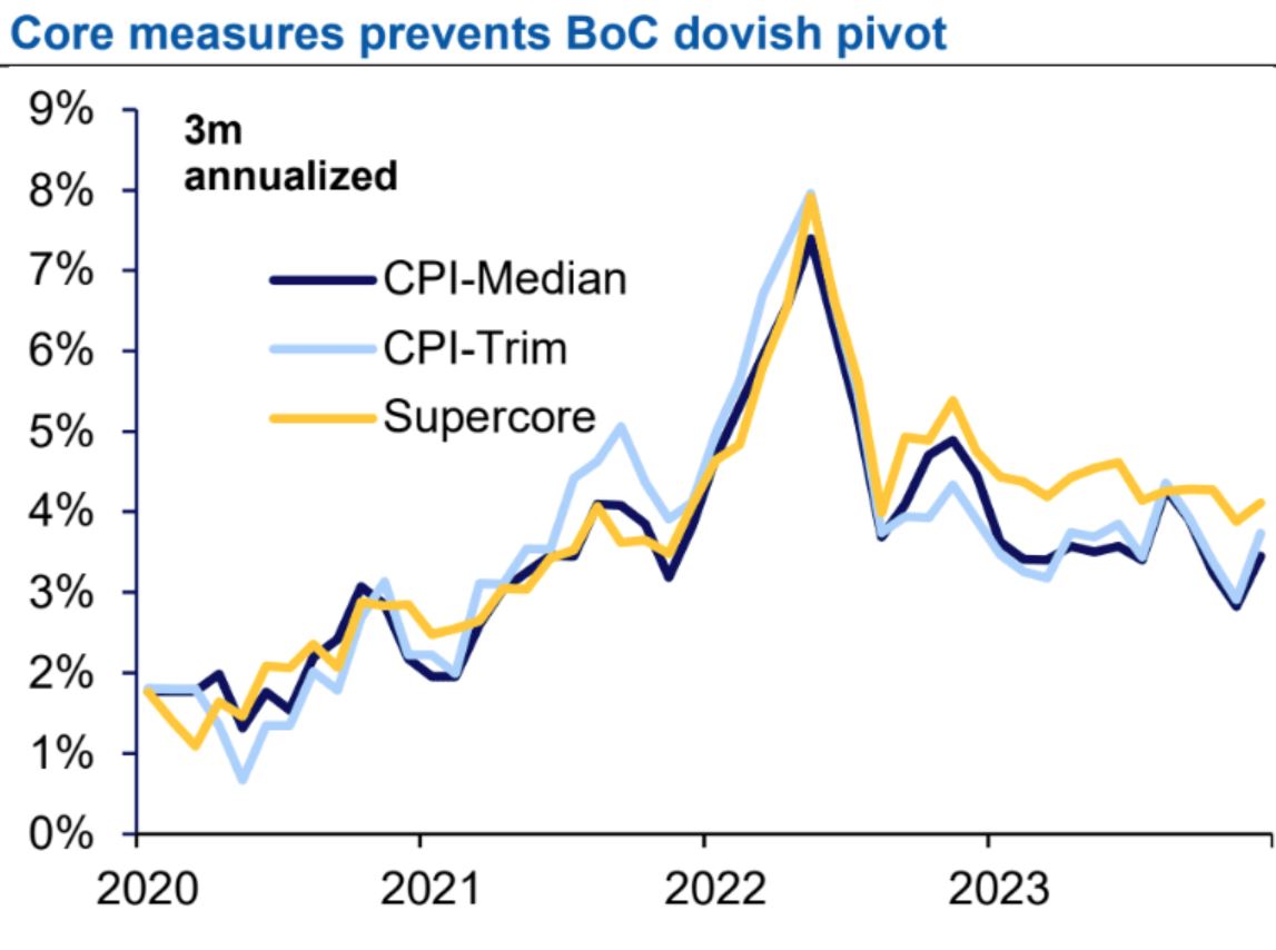 Monex Europe的外汇市场分析师尼克·里斯(Nick Rees)表示:“决策者可能会以这一上升为依据,为长期保持高利率提供支撑,这对我们预计加拿大央行将在2024年初放宽政策构成了风险。”