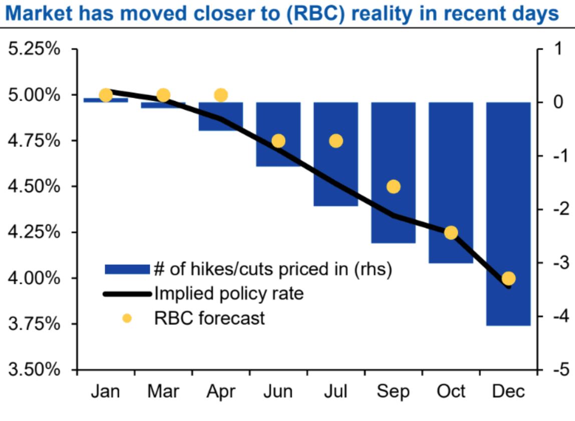 尽管如此,RBC的市场策略师仍然预计,风险将偏向于“比市场当前定价更少鸽派的结果(声明/发布者),这将推动近期趋势(债券收益率上升和近期降息定价的减少)”。