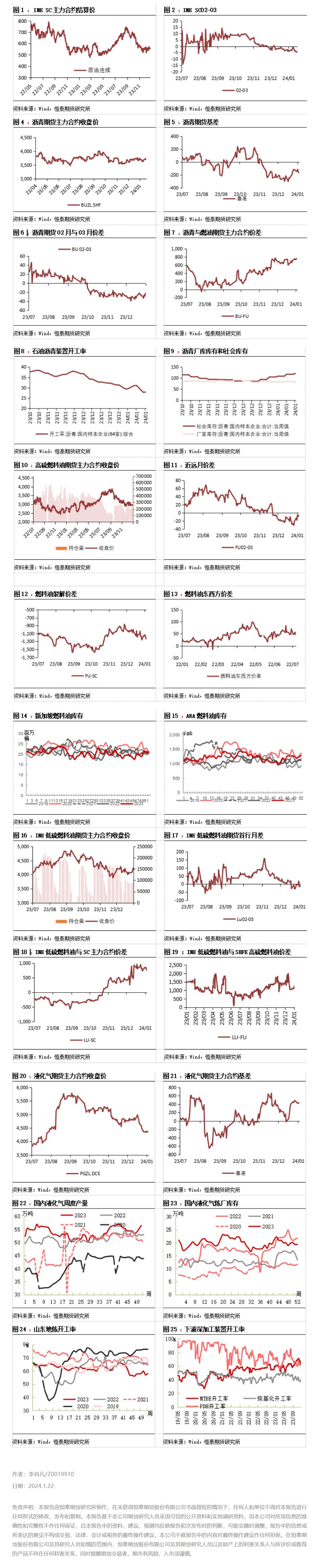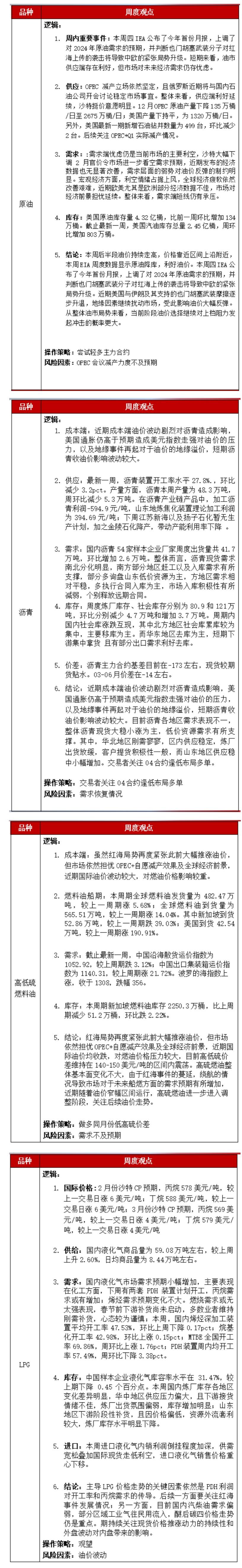 高低硫燃料油:地缘因素发酵,对成本端油价带来一定利好,但市场依然担忧OPEC+自愿减产效果及全球经济前景,近期国际油价均波动剧烈,对燃油价格压力较大。高硫燃油整体基本面变化不大,由于红海事件的蔓延,绕航的情况导致市场对于未来船燃方面的需求预期有所增加,近期随着油价窄幅区间运行,高硫燃油进一步进入调整阶段,关注后续油价走势。操作策略:观望。