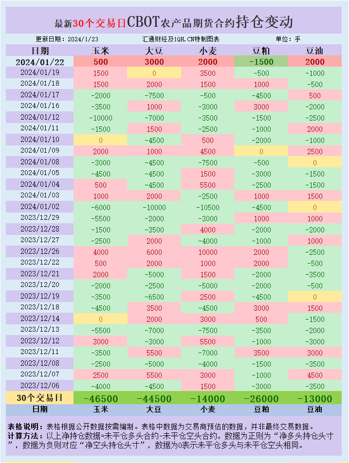海外交易商估算的结果显示,本周一(1月22日),大宗商品基金增加CBOT豆粕投机性净空头头寸,增加CBOT小麦、玉米、大豆、豆油投机性净多头头寸,CBOT未平仓多头与未平仓空头相同。最新30个交易日,大宗商品基金增加CBOT豆油、豆粕、大豆、玉米、小麦投机性净空头头寸。