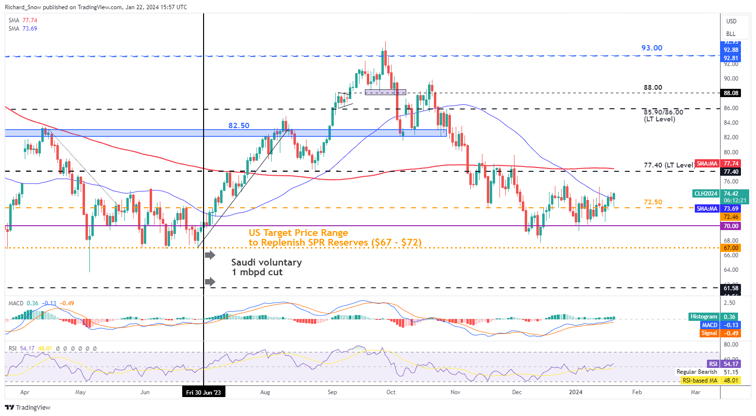 布伦特原油价格一直难以真正走高。MACD指标指向缓慢而稳定的上升趋势,尤其是在12月13日的低点之后。如果当前测得的上涨幅度进一步扩大,82美元似乎是一个关键阻力位。82美元的水平大致是200日简单移动平均线所在的位置。如果行情持续走弱,支撑位将一路下跌至71.50美元。另一支撑77美元是2020- 2022年主要上涨的50%斐波那契回撤位。