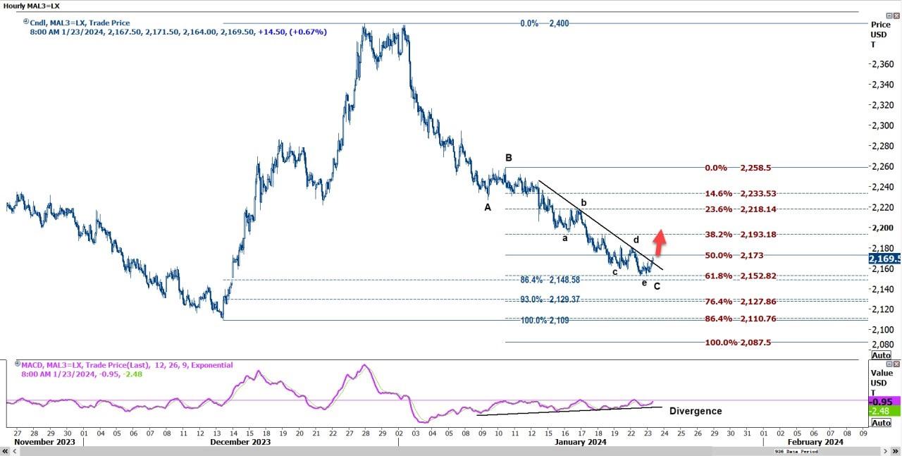 支撑位被确定为来自2258.50美元的C浪61.8%预测水平。这一波可能结束于2153美元附近,或延伸至2088美元。