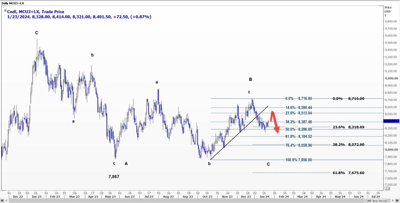 目前的观点是,回调完成后,下降趋势可能会恢复,沿着C浪。跌破8319美元可能会确认下跌趋势的延续。