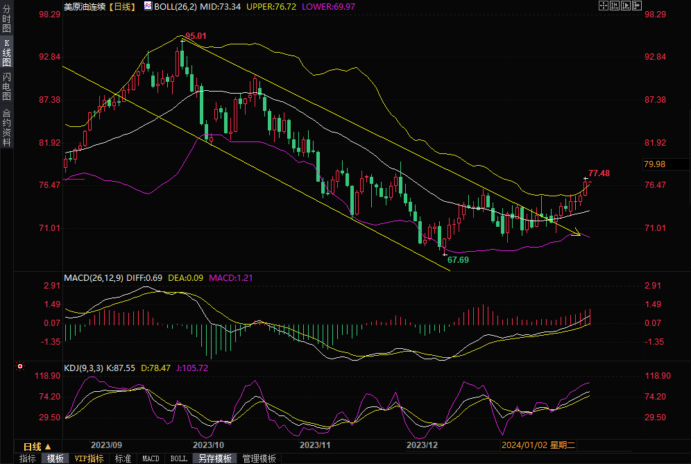 WTI原油期货2024年3月合约结算价收报77.36美元/桶,收涨3.02%或2.27美元/桶。