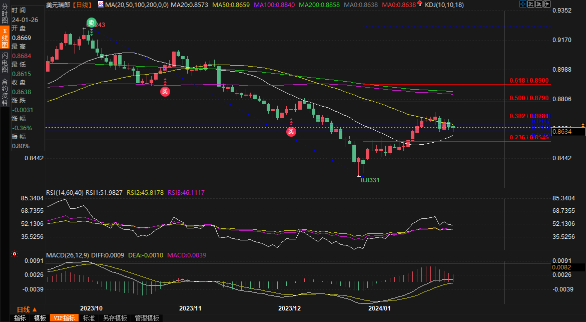 周一(1月29日),欧盘时段,美元/瑞郎小幅走跌。美元/瑞郎在亚盘开盘走高后回落走平,在欧盘迅速下跌后回升,实现V型反转。现报0.8629,跌幅0.10%。瑞郎主力现报1.1645,涨幅0.12%。