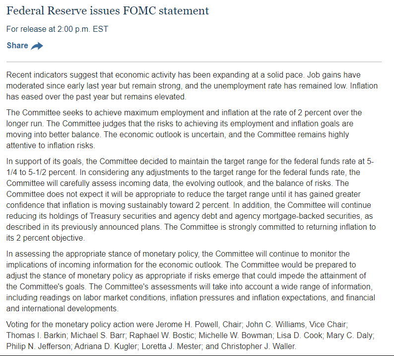 美联储在最新声明中删除了之前提到的有关美国银行体系仍保持稳健和韧性的说法,暗示去年一系列地区性银行倒闭事件构成的风险已经缓解。声明还删除了有关金融和信贷条件收紧可能影响经济活动、就业和通胀的说法。决策者一致同意此次政策决定。