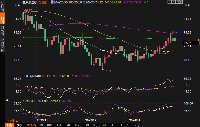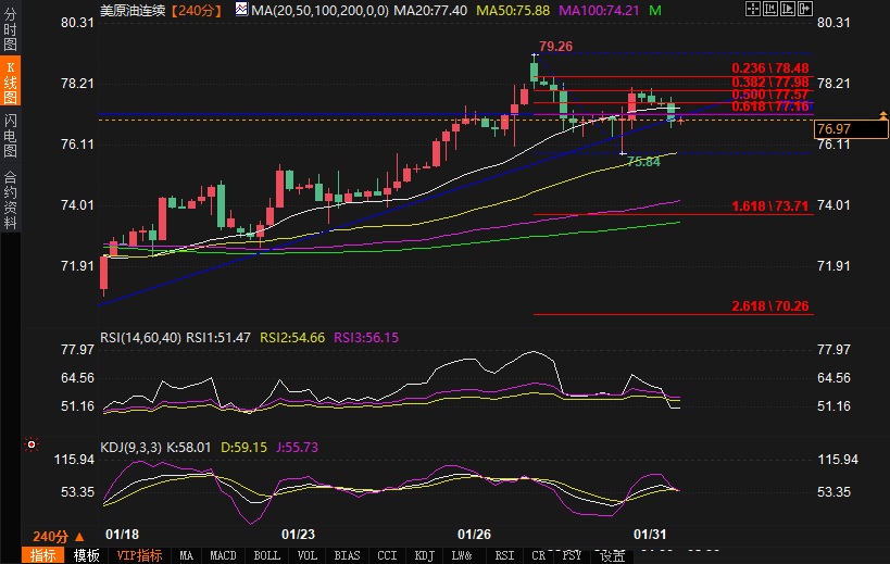 美原油连续震荡下跌,盘中报76.91美元每桶,跌幅1.1%。