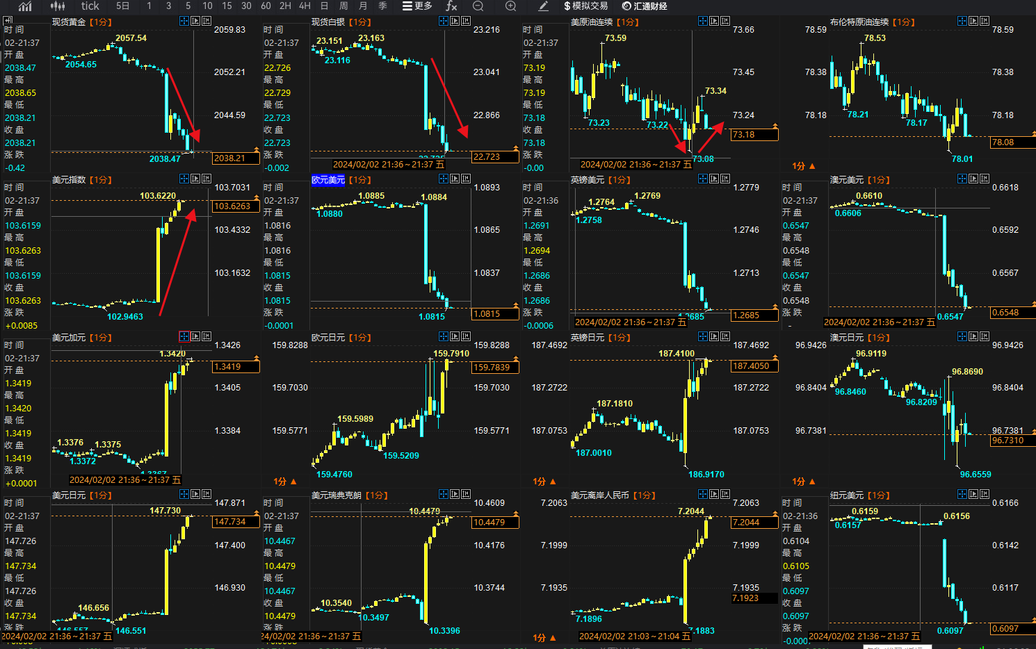 非农公布后1分钟,黄金及非美货币全线大跌,美国1月非农意外大增35.3万,美元指数1分钟暴涨逾50点至103.45上方,黄金1分钟跌11美元至2040,白银1分钟暴跌近0.3美元至22.789。不过美国原油基本没有出现卖压,仍是窄幅震荡行情,因一方面美元走强压制油价报价,但同时美国强劲经济利好原油需求,支撑油价。