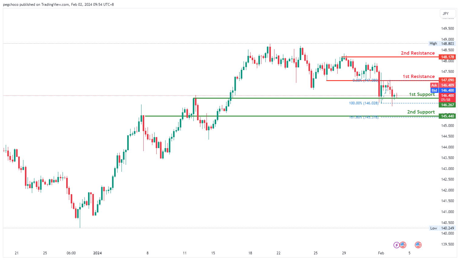 还有第二个支撑位在145.44,被描述为回调支撑位,与161.80%斐波那契扩展有关,进一步强调了其作为潜在支撑区的重要性。