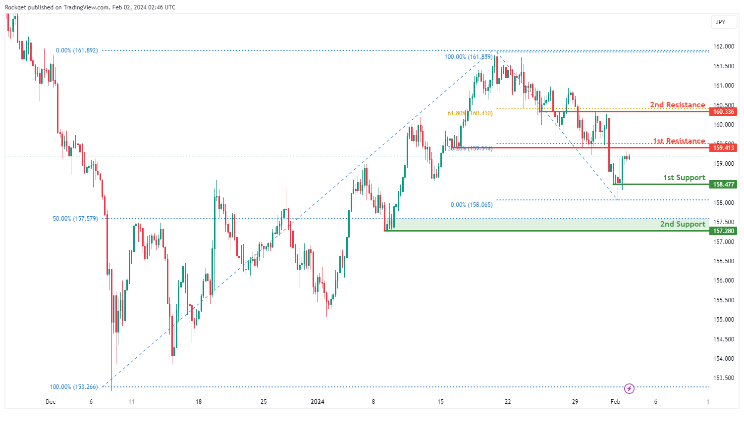第一个支撑位158.477被认为是一个有利的摆动低点支撑位,是之前买入兴趣出现的历史水平。