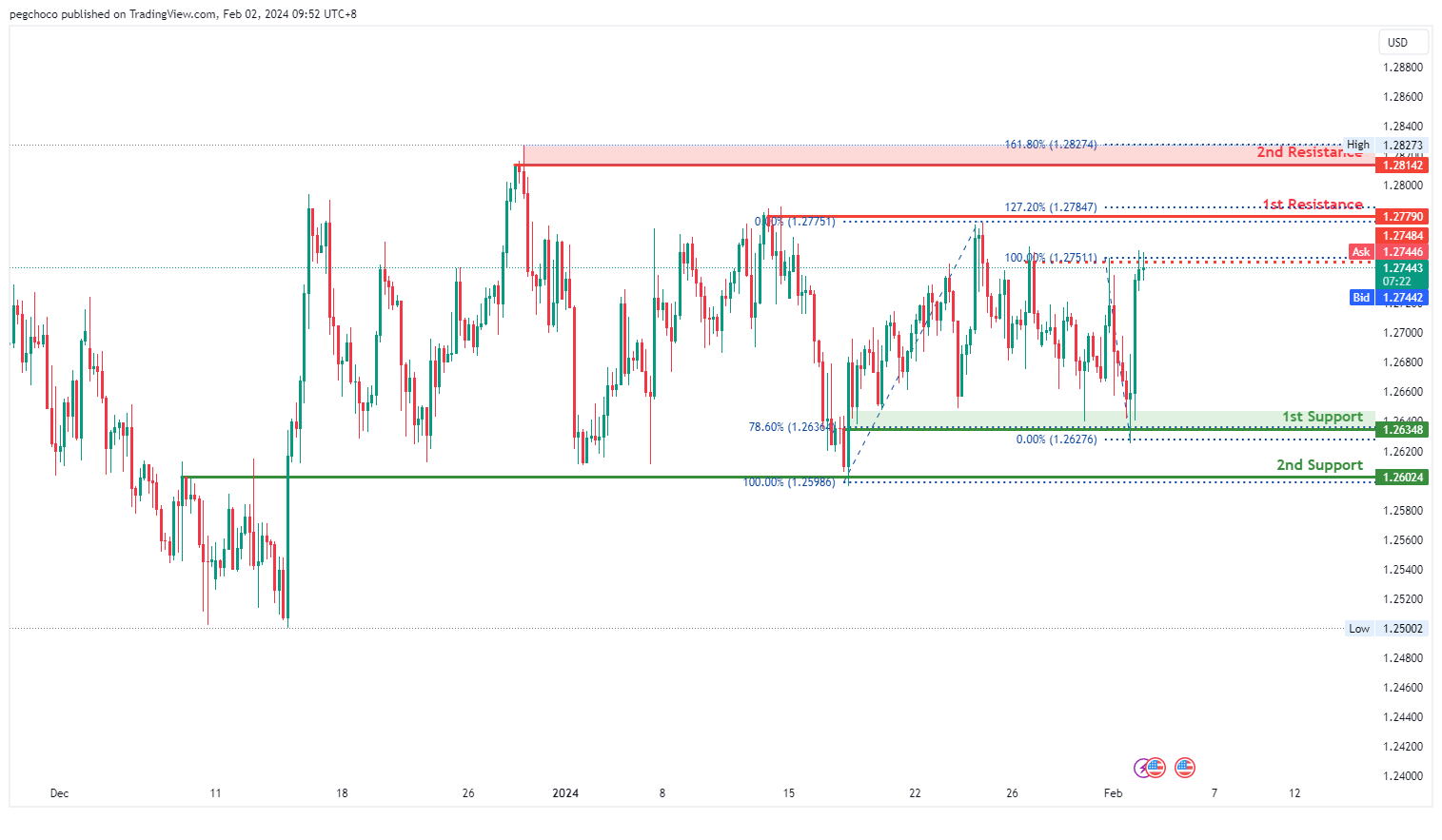 在阻力位方面,第一个阻力位1.2779为多波段高点阻力位,并因127.20%斐波那契延伸位的存在而得到加强。