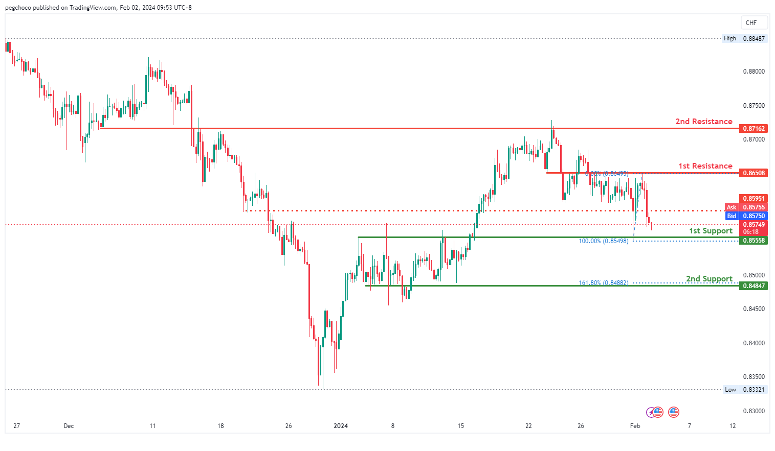 第二个阻力位0.8716也被确定为重叠阻力位,进一步加强了其作为阻力的重要性。此外,在0.8595有一个中间阻力位,为回调阻力位。